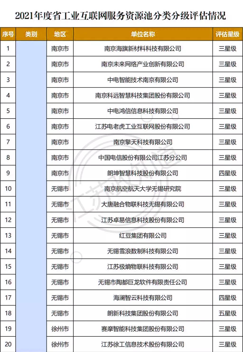 為貫徹落實(shí)《江蘇省加快推進(jìn)工業(yè)互聯(lián)網(wǎng)創(chuàng)新發(fā)展三年行動(dòng)計(jì)劃(2021—2023年)》《江蘇省“十四五”信息化和工業(yè)化深度融合發(fā)展規(guī)劃》,加快培育優(yōu)秀的工業(yè)互聯(lián)網(wǎng)服務(wù)商,強(qiáng)化資源池分類分級(jí)建設(shè),前期省工信廳組織開展了充實(shí)和加強(qiáng)省工業(yè)互聯(lián)網(wǎng)服務(wù)資源池建設(shè)工作。現(xiàn)將申報(bào)企業(yè)分類分級(jí)評(píng)估的結(jié)果予以公布,供工作參閱。