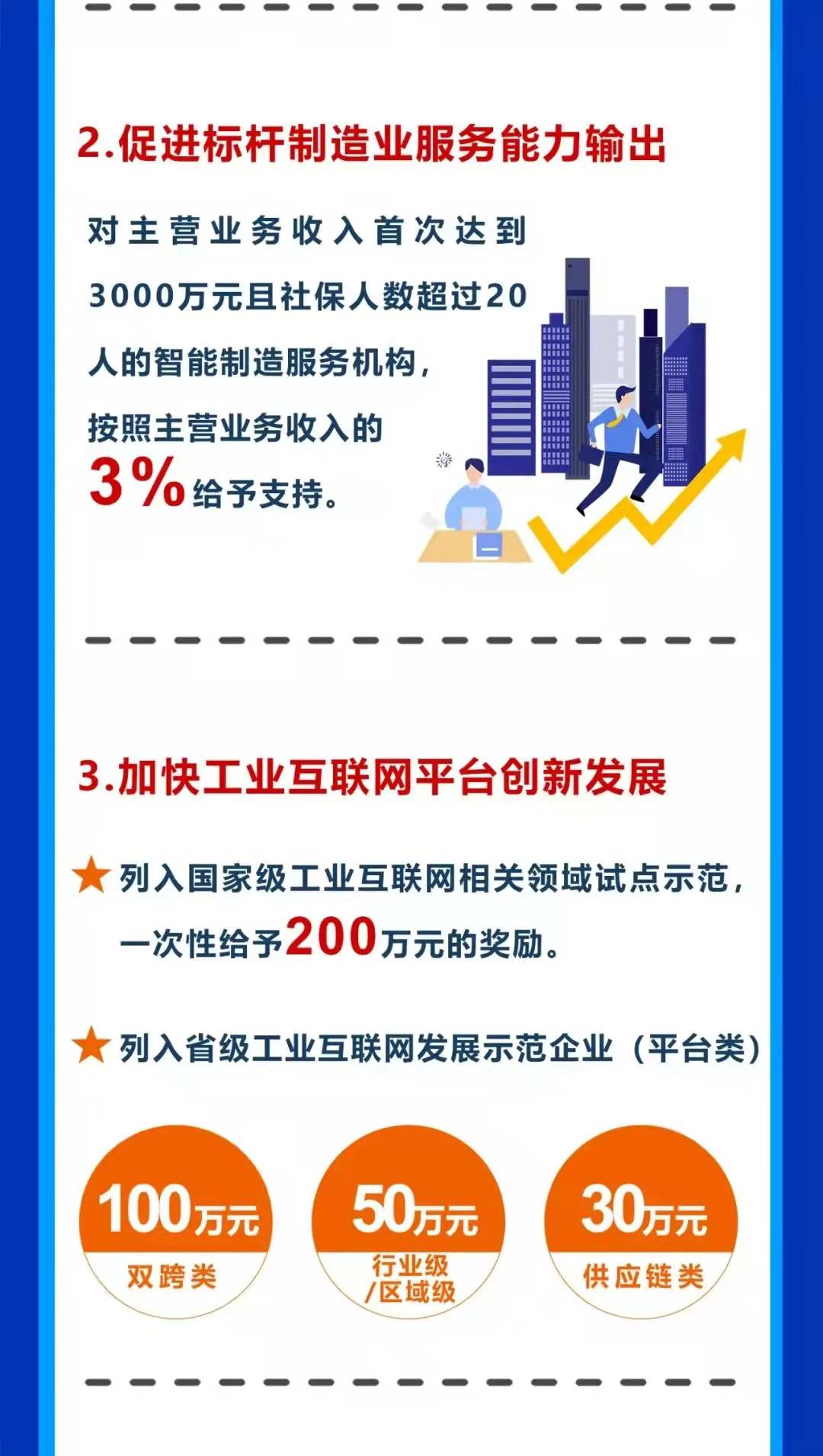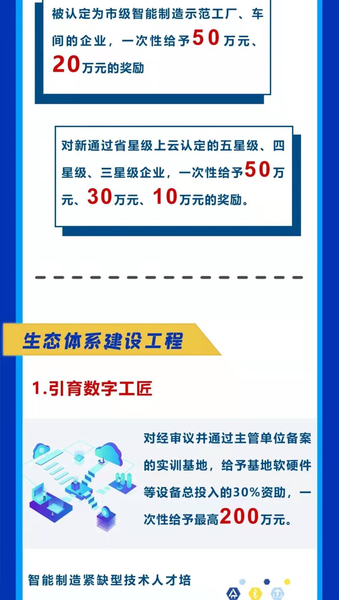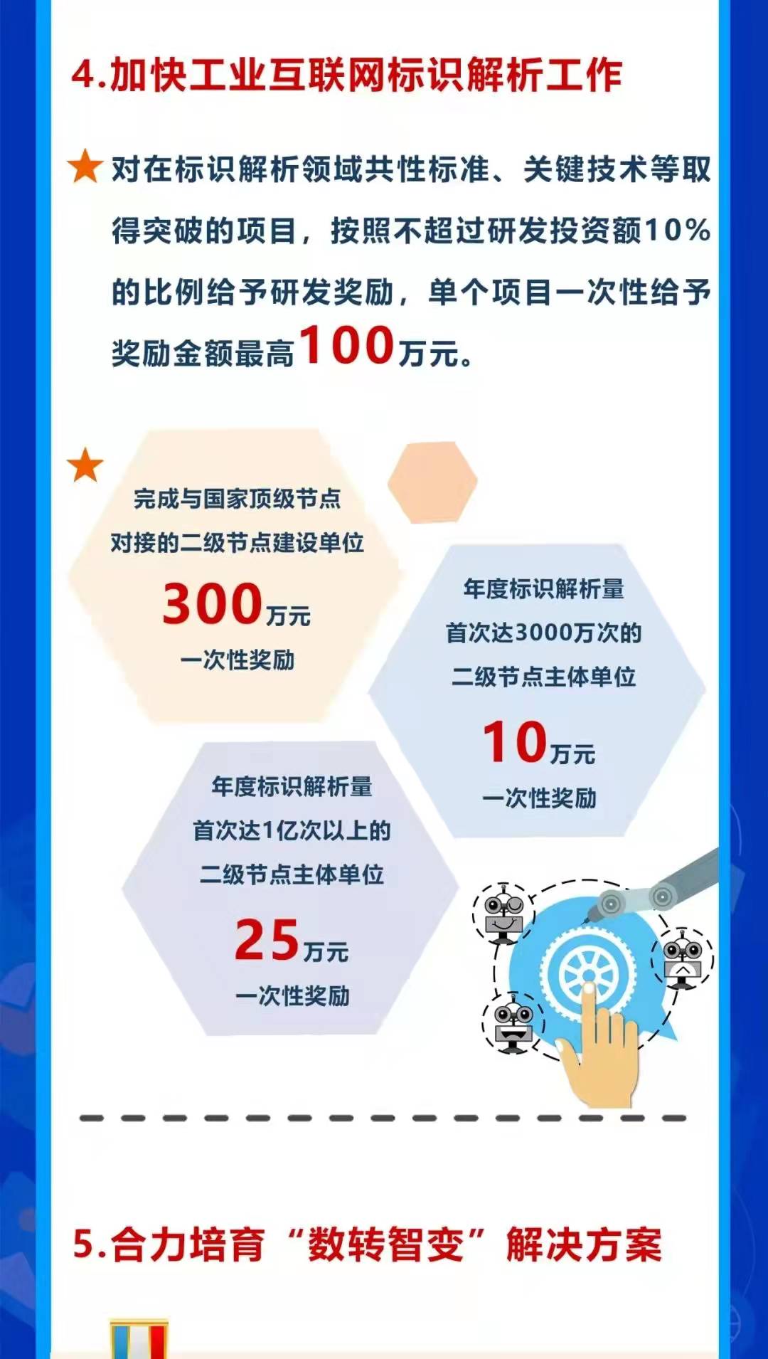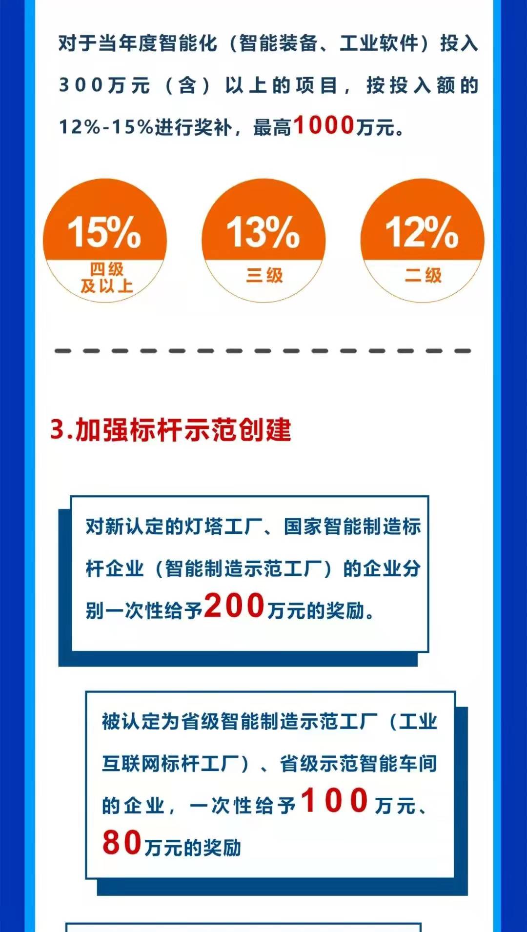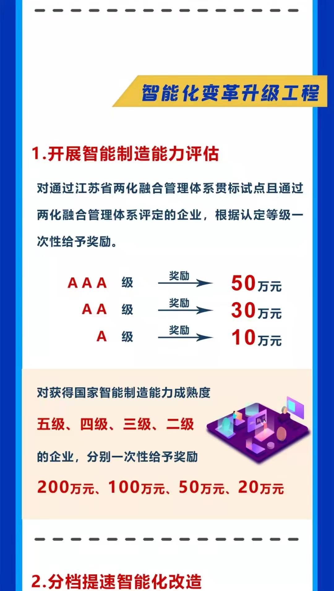 近日,無(wú)錫高新區(qū)發(fā)布了《無(wú)錫高新區(qū)關(guān)于深入推進(jìn)數(shù)字化轉(zhuǎn)型智能化變革的政策意見(jiàn)》。意見(jiàn)中明確:“將開(kāi)展智能化變革升級(jí)工程,對(duì)獲得國(guó)家智能制造能力成熟度五級(jí)、四級(jí)、三級(jí)、二級(jí)的企業(yè),分別一次性給予200萬(wàn)元、100萬(wàn)元、50萬(wàn)元、20萬(wàn)元獎(jiǎng)勵(lì)?!?/span>