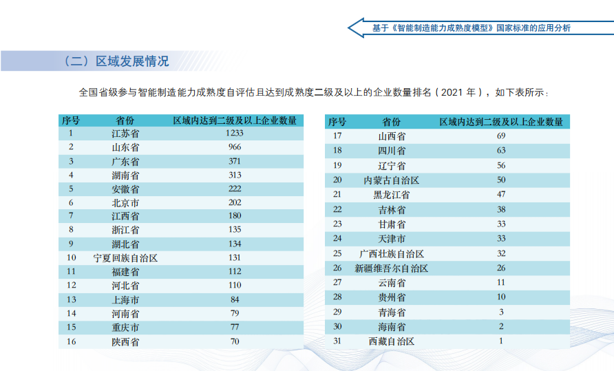 2022年3月,中國(guó)電子技術(shù)標(biāo)準(zhǔn)化研究院研究發(fā)布了《智能制造發(fā)展指數(shù)報(bào)告(2021)》,江蘇省參與智能制造能力成熟度自診斷且達(dá)到成熟度二級(jí)及以上的企業(yè)數(shù)量居全國(guó)首位。