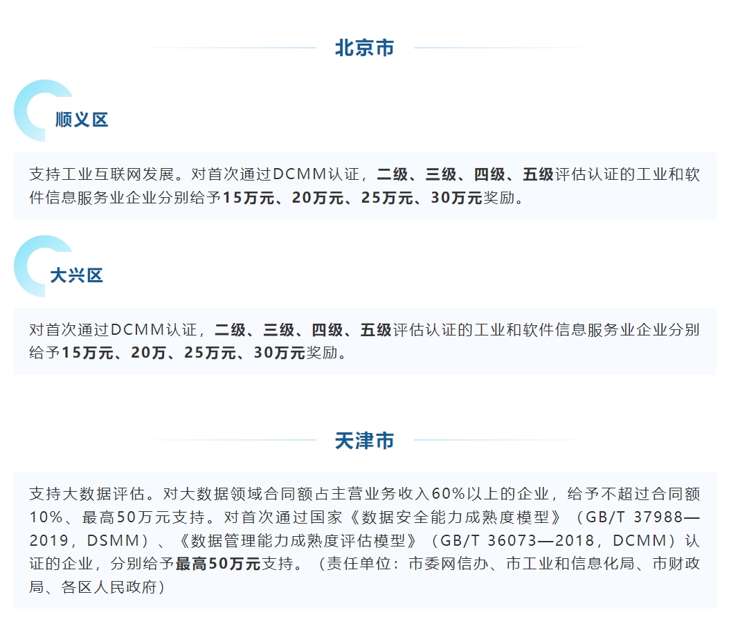 對首次通過DCMM(數(shù)據(jù)管理能力成熟度評估模型)2級、3級、4級評估認(rèn)證的企業(yè),分別給予最高20萬元、30萬元、50萬元獎勵。
