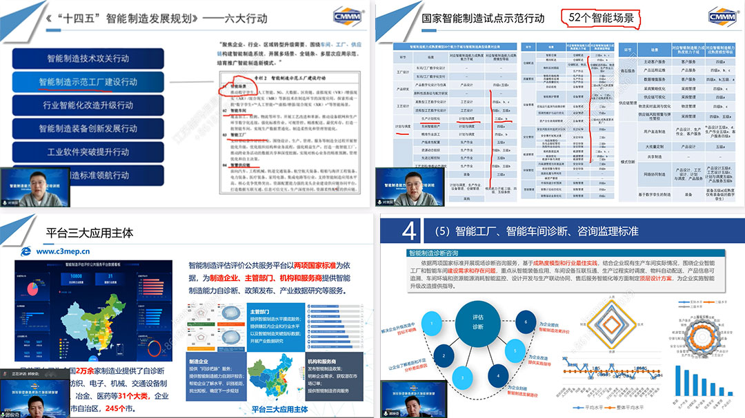 在線上培訓(xùn)一開始,中國電子技術(shù)標(biāo)準(zhǔn)化研究院華東分院副主任 葉宣辰 和 中國電子技術(shù)標(biāo)準(zhǔn)化研究院華東分院智能制造中心副主任 郎俊奇 分別對(duì)智能制造能力成熟度模型做了介紹,面向國家智能制造重大戰(zhàn)略政策及建設(shè)導(dǎo)向,對(duì)智能制造能力成熟度模型的5個(gè)等級(jí)和評(píng)估方做詳細(xì)介紹,為學(xué)員分享了標(biāo)準(zhǔn)的研制歷程、模型框架以及標(biāo)準(zhǔn)的應(yīng)用情況。同時(shí),結(jié)合企業(yè)現(xiàn)場(chǎng)實(shí)際評(píng)估案例對(duì)評(píng)估方法、評(píng)估流程等內(nèi)容進(jìn)行了分享,并介紹了智能制造評(píng)估評(píng)價(jià)公共服務(wù)平臺(tái)的應(yīng)用情況。